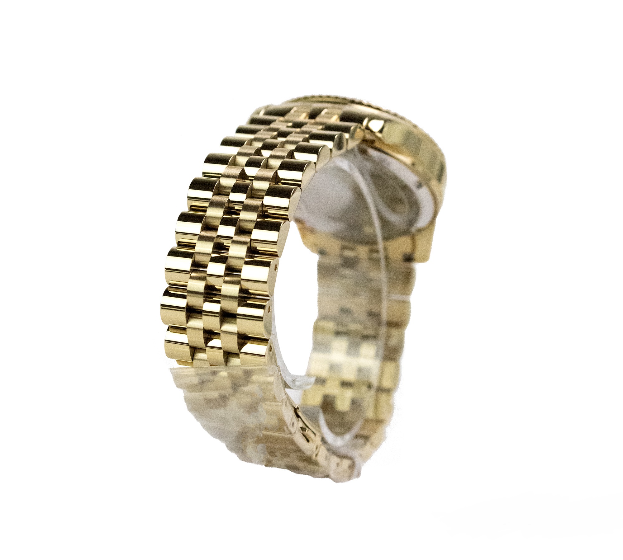 Merkmale: 12-Stunden-Zifferblatt, römische Ziffern, Tages-/Datumsanzeige, Druckknopf-Faltschließe, Armband